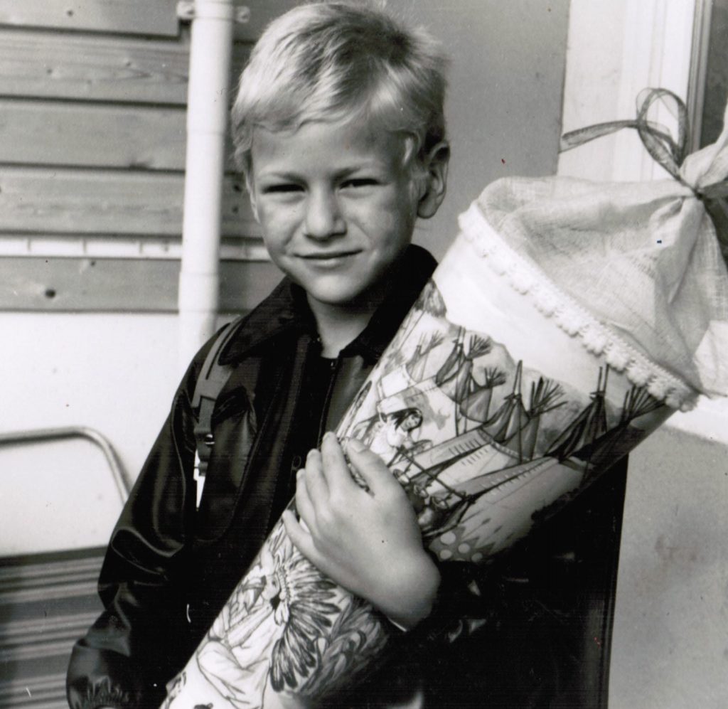 Photo of Carsten for school enrollment 1984 - a blond boy with school bag and sugar cone